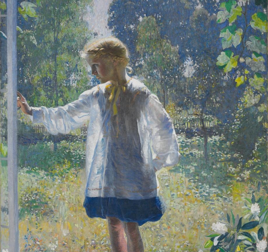 The James A. Michener Art Museum in Doylestown borrowed a work by the acclaimed Bucks County Impressionist Daniel Garber. A commanding yet tender portrait of the artist’s young daughter, Tanis is distinguished especially by its striking use of backlighting. It was painted in 1915 at Garber’s home in the Cuttalossa Glen, near New Hope, not far from the museum. The painting was presented in context with a large-scale mural by Garber and an installation of similarly-scaled murals by Edward Steichen.