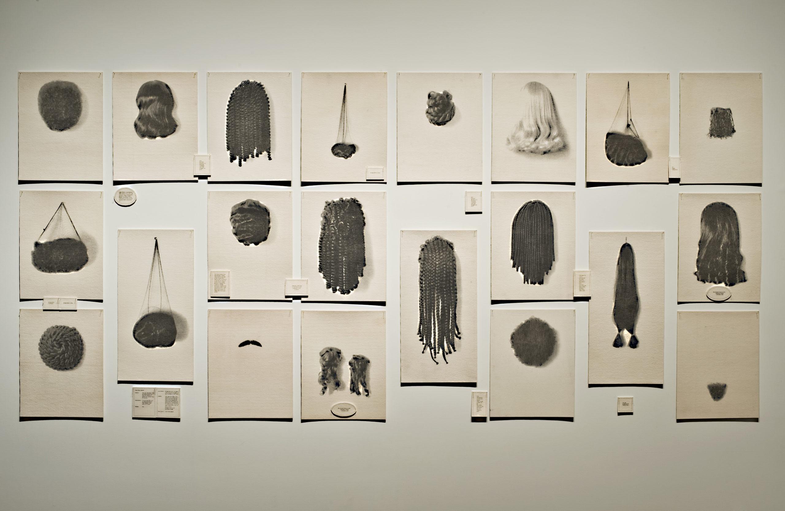 Central to the exhibition is Wigs by Lorna Simpson, who presents an array of wigs and hairpieces from thick braids and weaves to smooth blond locks.