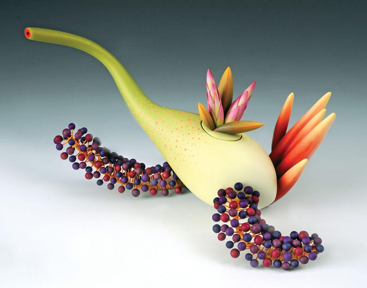 Jeffrey Lloyd Dever, Seeking Solace (Teapot), 2011. Polymer, plastic-coated wire, and steel wire, 5 1/8 x 10 1/2 x 5 1/2 inches. Racine Art Museum, Gift of the Polymer Art Acquisition and Care Fund.