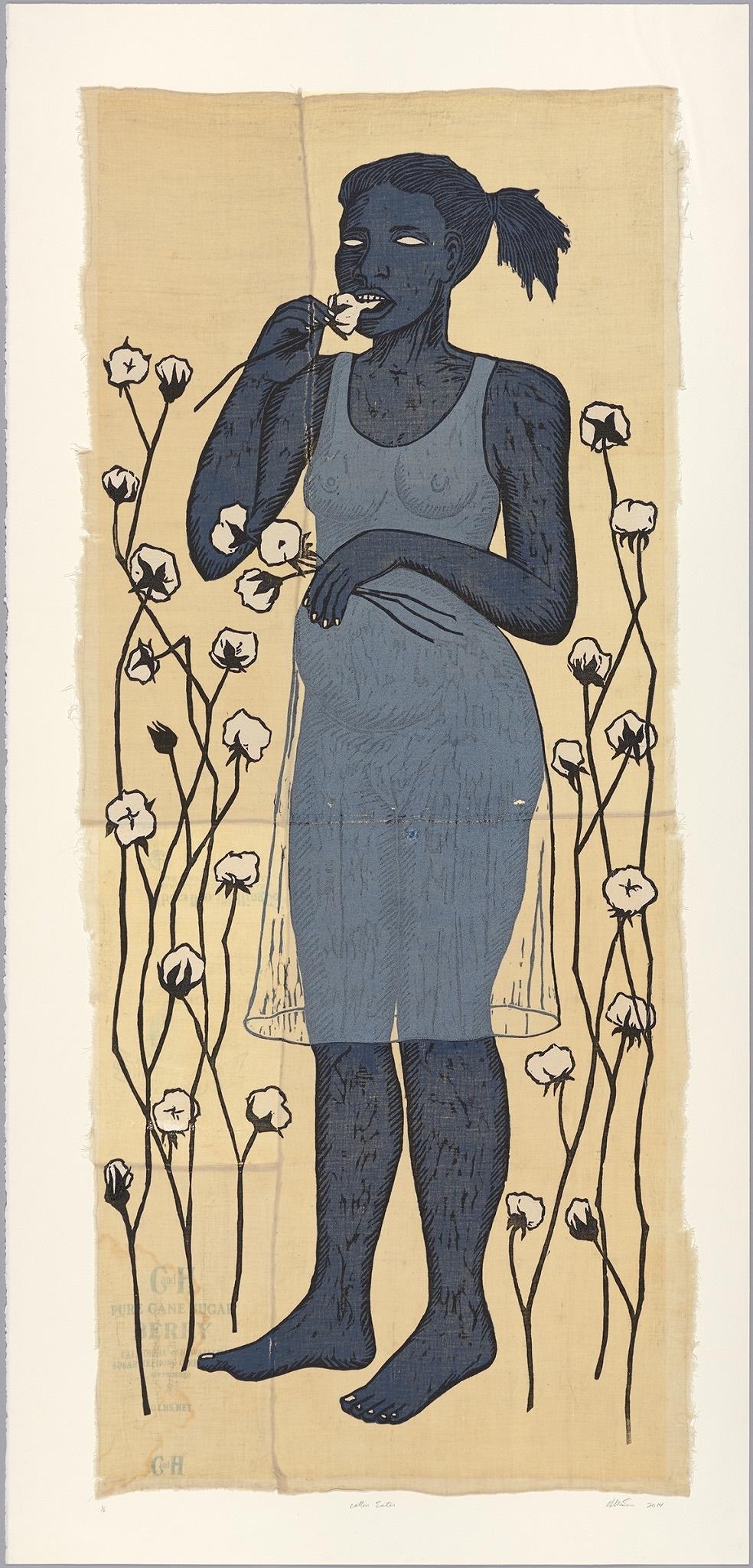 The exhibition’s imagery focuses predominantly on solitary women in various poses reminiscent of historical African deities and ancient Greek statuary. In many of Saar’s works, she charts the tragic history of slavery in America, but her figures telegraph defiance and strength. Other recurring motifs are jazz, gender roles, and desire. Among the exhibition’s highlights are the prints Sweeping Beauty (1997), Washtub Blues (2000), Cotton Eater (2014) and Black Bottom Stomp (2017) and the sculptures Mirror, Mirror (Mulata Seeking Inner Negress) (2006) and White Guise (2018).