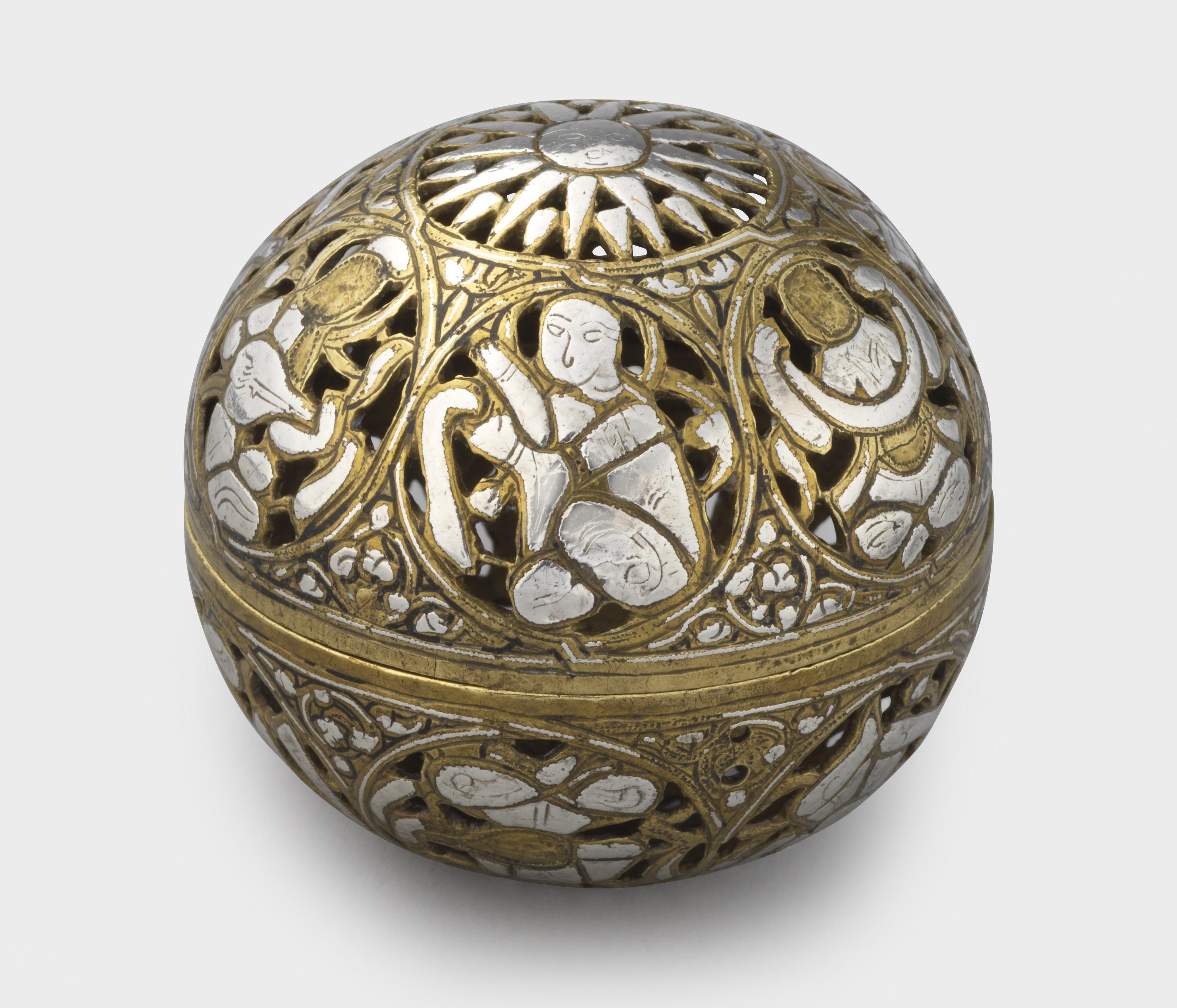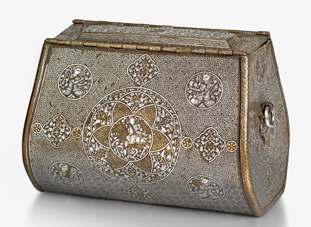 The highlight of the exhibition is a woman’s metal handbag, the only surviving example of its kind. It was made in the early 14th century in Mosul, northern Iraq for an important lady based in the courtly circles of the Ilkhanid dynasty. This handbag, known as the Courtauld Bag and decorated with images of eight musicians playing instruments, shows the incredible metalworking skills passed down through generations.
