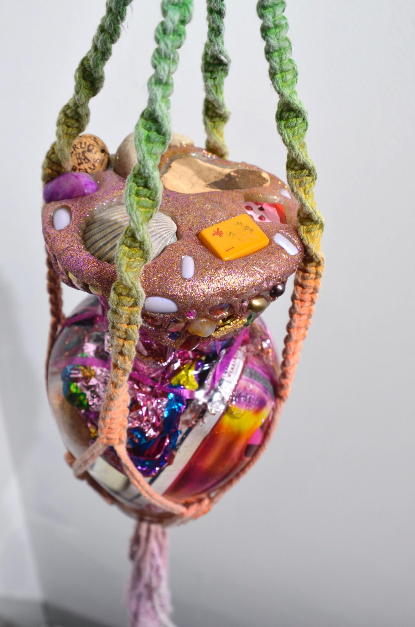 Suspended in my Masquerade, referencing a lyric from Springsteen’s Growin’ Up, investigates the complex rituals surrounding memory and sentimental objects. Driven by a strong emotional connection to her family, friends and community, Klinghoffer pays homage to the past by literally suspending those personal items in time and space, imploring viewers to excavate. Simultaneously organic and alien-like, her sculptural forms are covered, surface textures obliterated and then exquisitely adorned with small embedded objects of personal significance. Surface colors reference the Romantics, particularly the Hudson River School with its emphasis on the subtleties and range of light. Her laboriously manipulated sculptural shapes hint at everyday objects including pre-loved sneakers, repurposed precious and semiprecious stones including rubies, sapphires, emeralds, even diamonds. Closer inspection allows for explanation of the greater meanings designated to each item. Materials lists read like memories, items like “one of the vintage boots I wore all through undergrad”, and “coral necklace from uncle”.