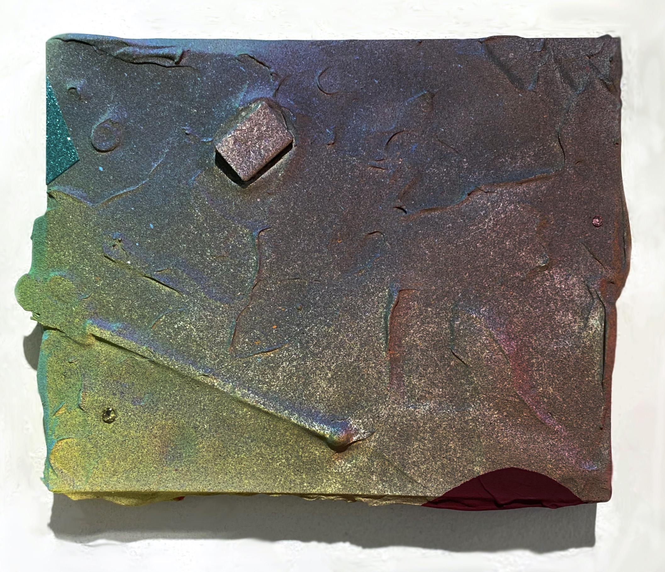 This new series of work incorporates the craft of memory glass-making into the sculptures, a popular activity for girls during the time of Klinghoffer’s own bat mitzvah celebrations. Titles of the works are pulled from the lyrics of her playlists. As with her work, she pulls from what already exists in the world. Individual pieces take their names from The Grateful Dead, Talking Heads, Beatles, Tom Petty, Drake, Paul Simon, Phish, TV on the Radio, and so on. By repurposing materials, making and remaking them into paintings and sculptures, she prompts a reimagining of uses for these relic-like objects. Articles reflect the artist’s personal connection to femininity, craft-making, Judaism, romance, pushing the definition of painting. Through time, the items become specimens, icons. They are poked, prodded, stained, sprayed, stroked, rubbed, dipped, then pulled, torn, cracked open and broken apart making up and becoming the new work.