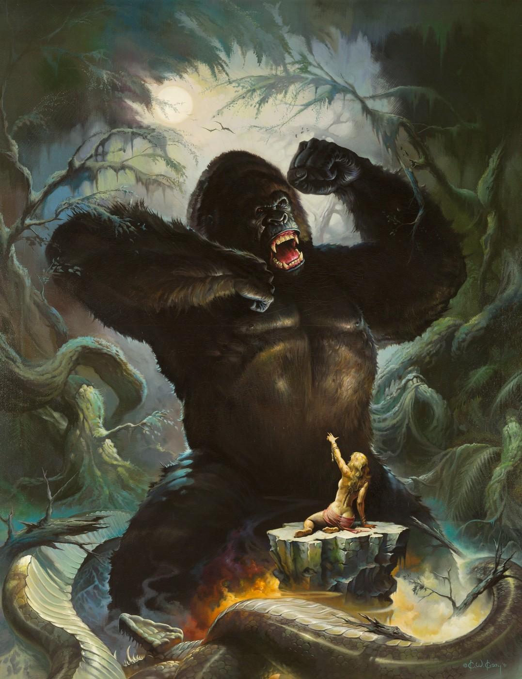 Ken Kelly The Mighty King, 1991 (estimate: $15,000-25,000) plays on a popular theme, with the petite damsel Ann Darrow facing Kong, who is so bold that it’s easy to miss the fact that the stone pedestal on which Darrow sits is completely surrounded by a giant snake. The large (53-1/2-by-41-inch) oil on canvas is signed and dated lower right by Kelly, a favorite artist among fans.