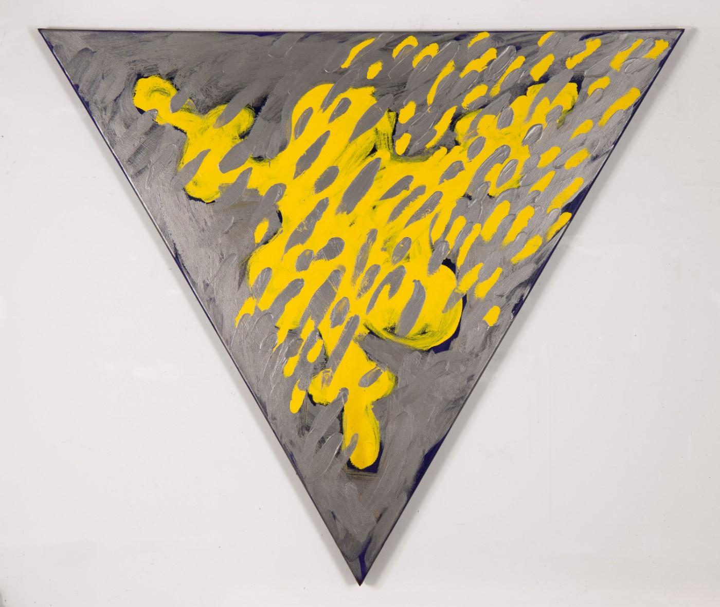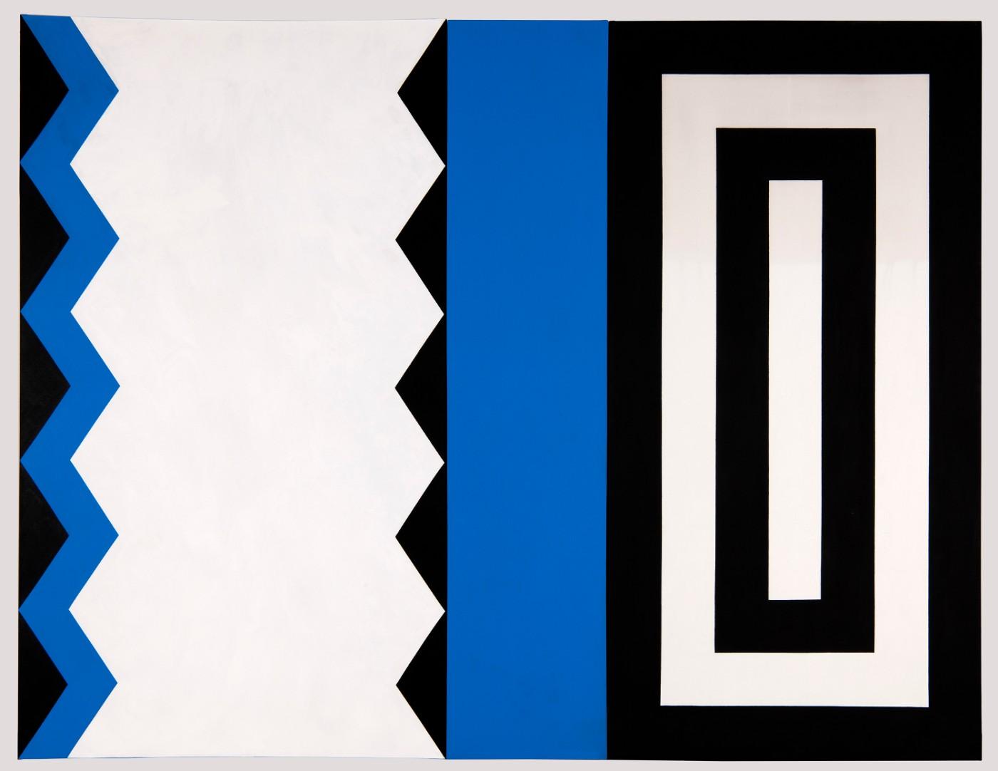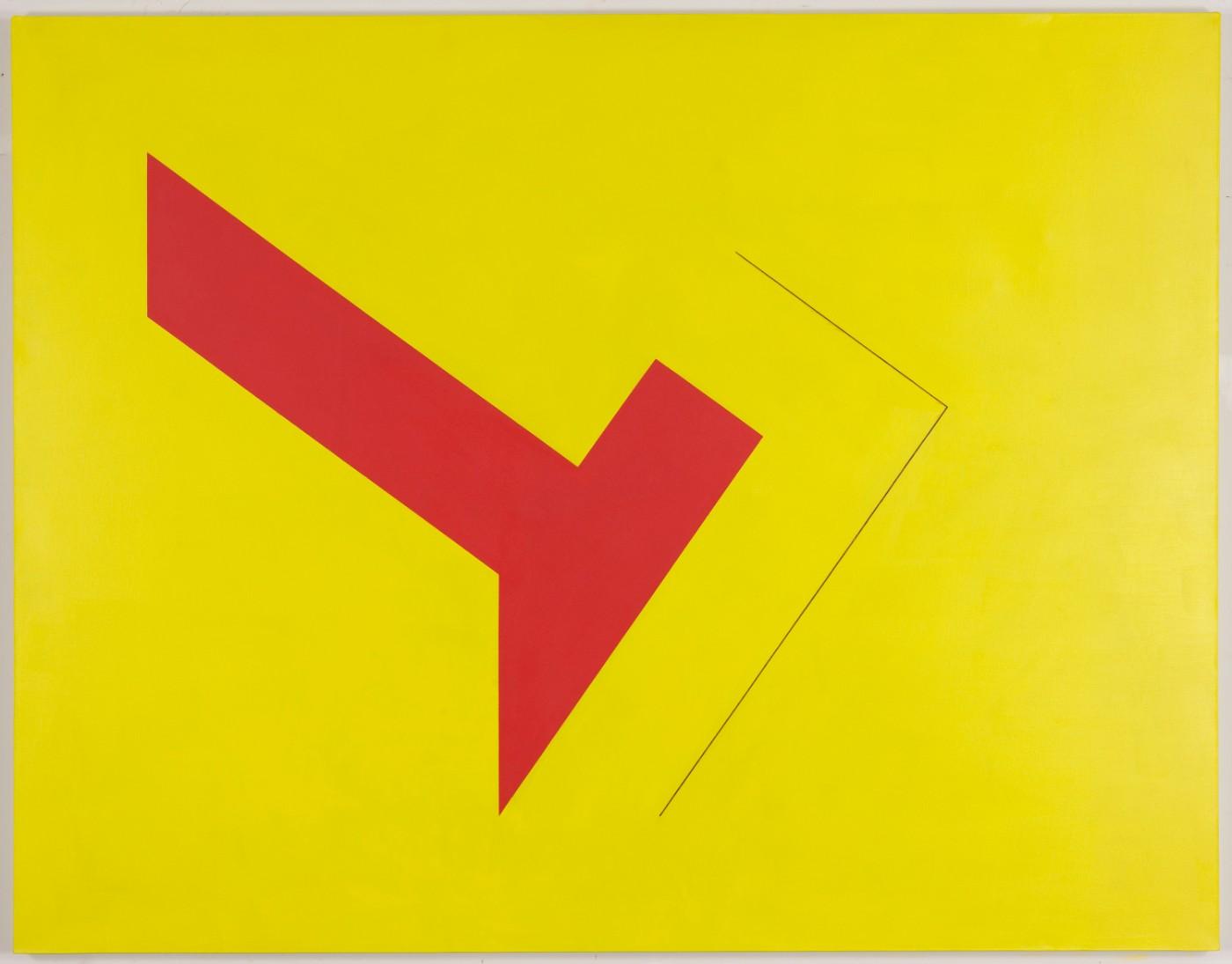 Robert Huot Paintings includes major, representative works from all eras of his career. His early paintings, such as Chriss, 1964, demonstrate Huot’s ability to create a dynamic, active composition with a minimal palette and few forms. Shear, 1963, disrupts the expected single plane of a painting’s surface by shifting the vertical painted bands in relation to the actual line where the works’ two panels meet. By the middle of the 1960s, Huot was preoccupied with uniting his paintings with the wall. He experimented with several kinds of solutions, including using rounded stretcher bars in works such as Silver Kiss, 1968. In the same pursuit, Huot created a series of works made of translucent nylon stretched over silver-painted bars, saying, “The nylon took the painting’s clothes off and let the wall show through.” By 1969-70, Huot had abandoned object-making for filmmaking and conceptual art.
