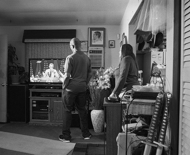 LaToya Ruby Frazier (American, b. 1982), Shea's Aunt Denise and Uncle Rodney in their home on Foster Street watching President Barack Obama take a sip of Flint water, 2016–2017. Gelatin silver print; Edition 2/5.