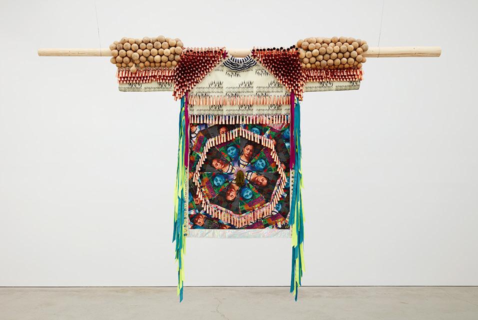 Jeffrey Gibson (Choctaw and Cherokee, b. 1972), The Anthropophagic Effect, Garment no. 2, 2019. Canvas, cotton, vinyl, brass grommets, nylon thread, artificial sinew, dried pear gourds, copper jingles, glass and plastic beads, nylon ribbon.