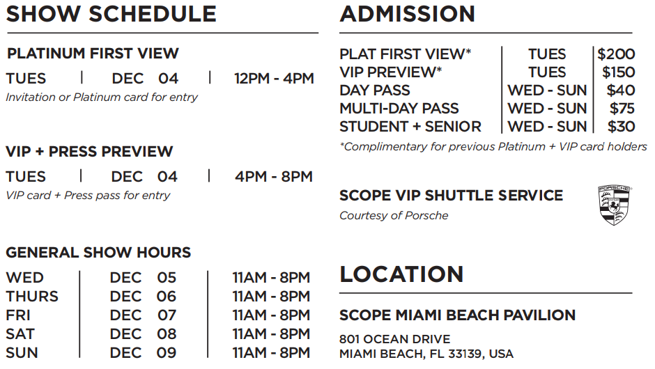 SCOPE Miami Beach opens on December 4, with its Platinum First View and VIP + Press Preview, and will open to the public December 5-9, 2018.