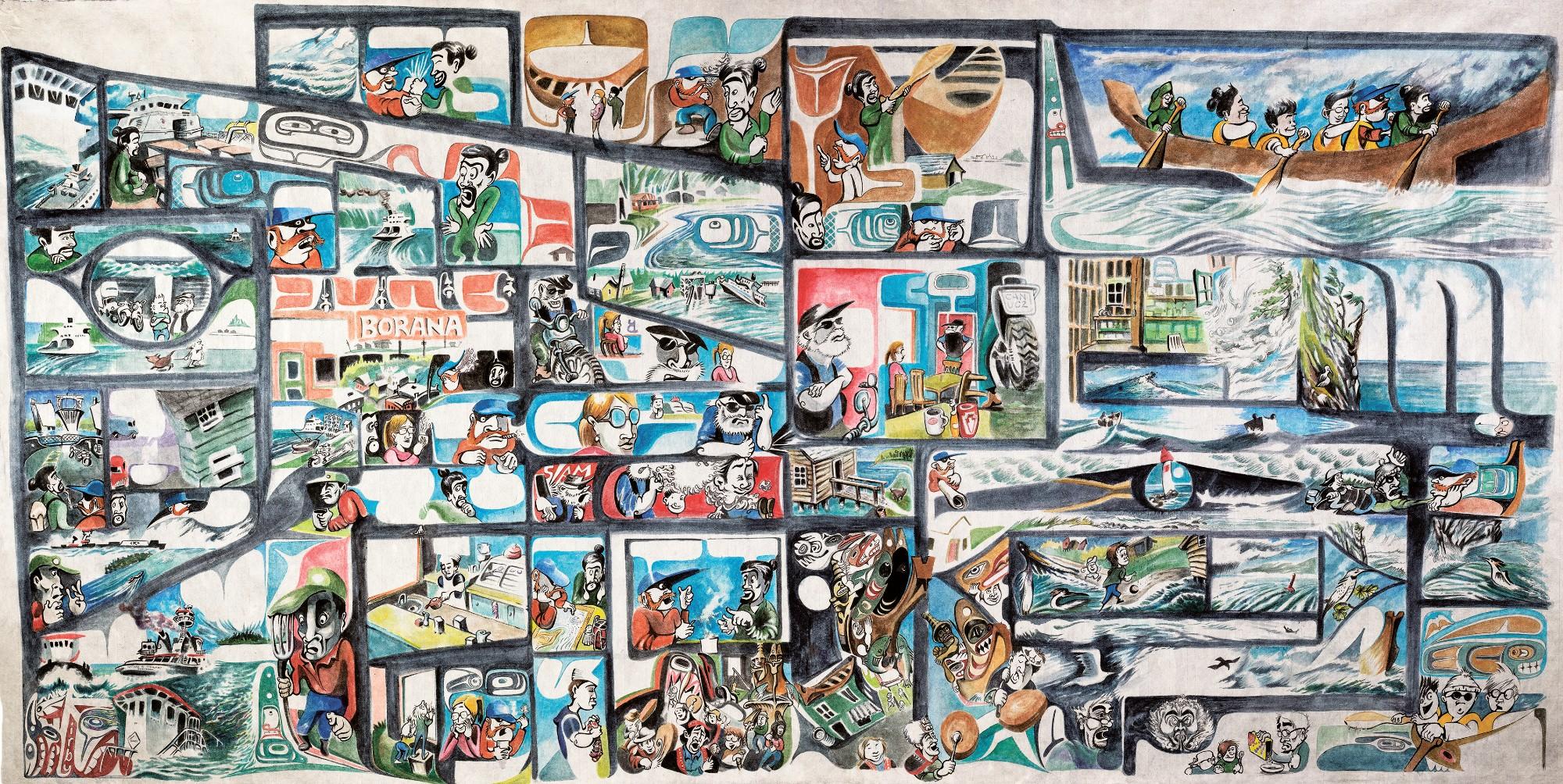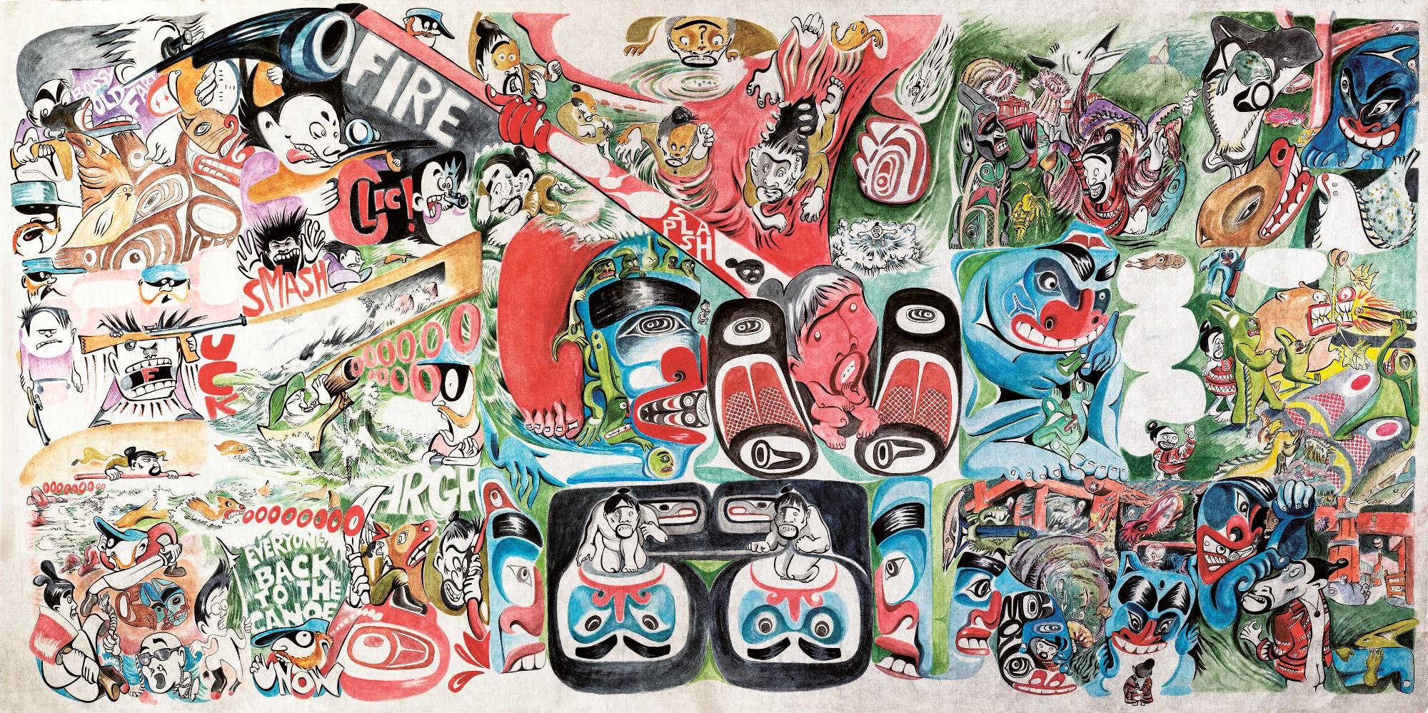 SEATTLE, WA – The Seattle Art Museum (SAM) presents Michael Nicoll Yahgulaanas: Carpe Fin (November 1, 2019–November 1, 2020), a new installation featuring work by the Vancouver-based Haida artist. The centerpiece is Carpe Fin, a 6 x 19–foot watercolor mural that is a major commission for SAM’s collection. Yahgulaanas describes its style as “Haida manga,” blending several artistic and cultural traditions including Haida formline art, Japanese manga, Pop Art, and graphic novels.