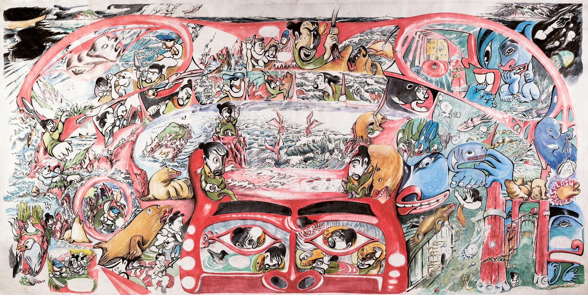 Michael Nicoll Yahgulanaas (Haida, b. 1954), Carpe Fin (detail), 2018. Watercolor and ink on handmade Japanese paper, 6.5 x 19.7 ft. Seattle Art Museum, Ancient and Native American Art Acquisition Fund, McRae Foundation and Karen Jones, 2018.30.