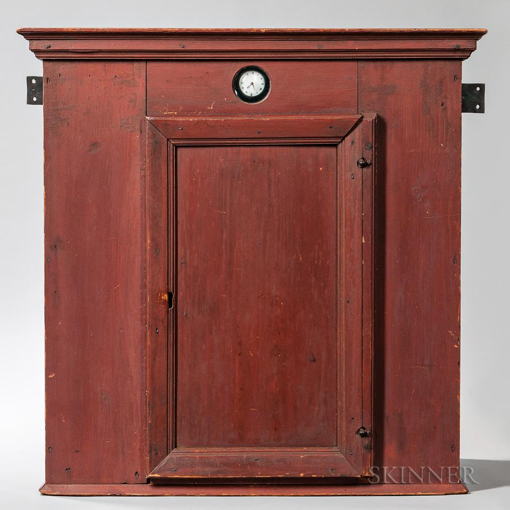 Rare Early Red-painted Pine Hanging Cupboard with Glazed Watch Window and Silver Pocket Watch, 18th century (Lot 28, Estimate: $4,000-6,000)