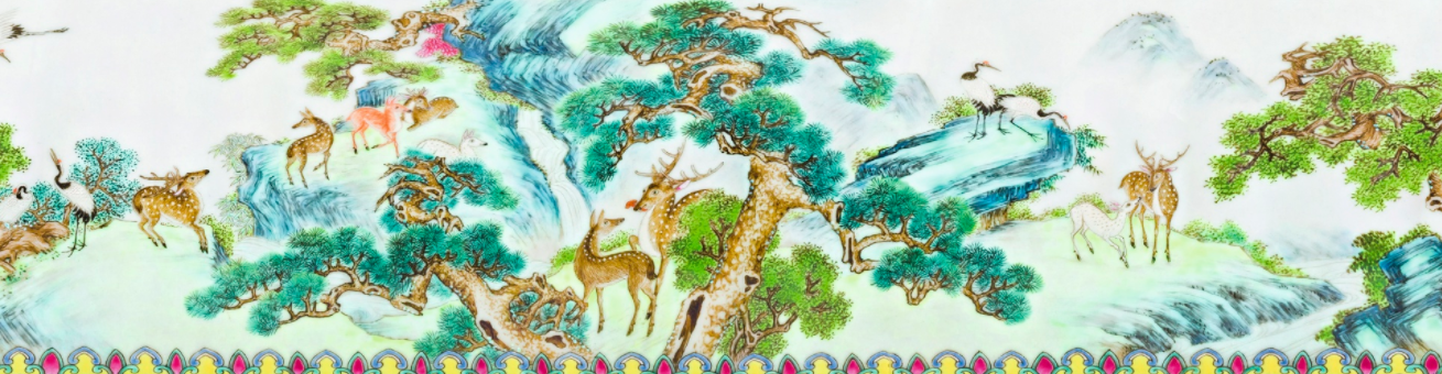 The vase, to be sold at Sotheby’s in Paris, has a body encircled by a magnificent landscape with deer, cranes and pine trees, all auspicious symbols of health and longevity: a genuine painting on porcelain showing nine fallow deer and five cranes in a rocky landscape with a tumbling waterfall, surrounded by gnarled pines and mist-covered peaks expressing all the artist's dazzling talent. Only one other similar vase, although with slightly different subject matter and decorative borders, now in the Guimet museum in Paris, is known. This naturalistic garden most probably illustrates one of the Imperial parks designed for the Emperor's delight. The scene may seem ordinary, but is in fact highly symbolic. The fallow deer, synonymous with happiness and prosperity, is often shown as the mount of the god of longevity. Cranes, personifying old age, also carried immortals through the air. Lastly, immortality is represented by lingzhi, mushrooms growing on the islands where the gods dwelt.