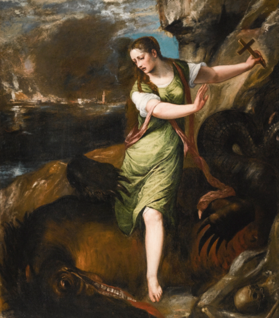 As is characteristic with Titian’s late works, the darker tones, fiery landscape and swift handling of the paint in the present work create a sense of drama that is entirely fitting to the narrative. Titian depicts the legendary virgin martyr, Saint Margaret, as she emerges unscathed from the body of Satan, who had appeared to her in the form of a dragon and swallowed her whole. The cross she held in her hand irritated the monster’s insides and the dragon burst open allowing her to escape unharmed. Painted in a myriad of colors, her luminous light green tunic with its bright white sleeves and rose pink veil stand out from the earthier, brown based tones of the rest of the canvas. The dragon that occupies the bottom register of the canvas is predominantly painted in brown and blackish hues and the only flashes of color are the strokes of red and white delineating his vicious mouth. Depicted in dramatic contrapposto, the implied movement in Saint Margaret’s twisting body contrasts to the solidarity of the rock behind her, emerging from the picture plane as an impressive figure, trampling the dragon underfoot and holding her crucifix aloft.