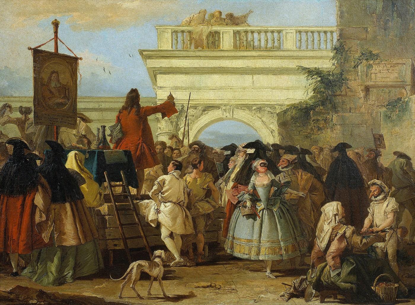 In Casanova’s time, Venice was a city of masks. Within the rigid Venetian social hierarchy, the mask afforded a degree of anonymity—allowing wearers to interact across classes, and lending an appearance of equality in a city whose inhabitants constantly jockeyed for social status. The importance of masquerade in Venetian culture is explored through paintings such as The Ridotto of Palazzo Dandolo (about 1750, Private Collection) by Francesco Guardi and The Charlatan (1756, Museu Nacional d’Art de Catalunya, Barcelona) by Giovanni Domenico Tiepolo. Additionally, brightly costumed and elaborately posed porcelain figures from the MFA’s collection represent stock characters from commedia dell’arte, a popular genre of entertainment performed in theaters and outdoors throughout Europe.