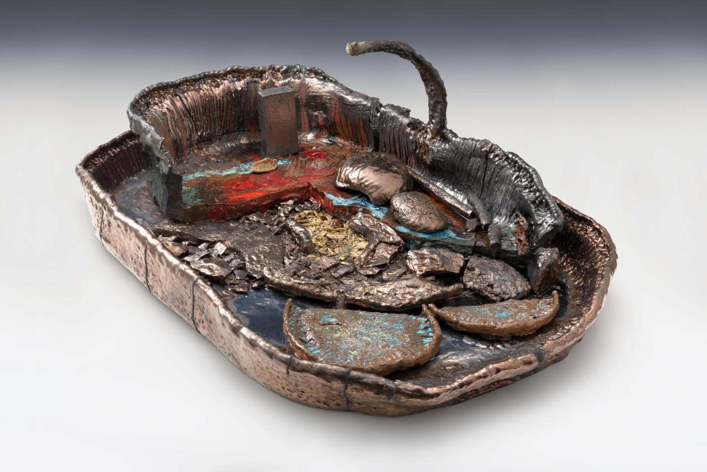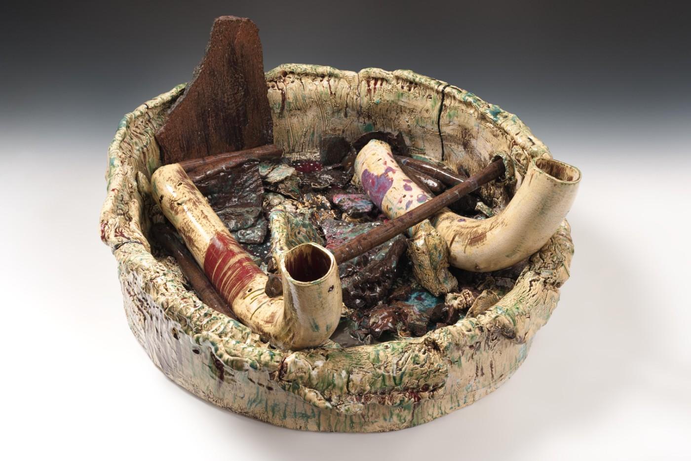 Sculptures in clay have long held a fascinating and primary position in Ruby's broader studio work. Though he has no interest in separating himself from the history of his materials, Ruby upends tradition by creating hybrid ceramic forms that are simultaneously familiar and alien. In a process heavily indebted to craft, he manipulates clay by hand and machine to arrive at basins or vessel-like containers that often hold the debris of previous kiln misfires. Akin to an Abstract Expressionist canvas, the clay provides a responsive, tactile surface that records Ruby's aggressive gestures. The finish on each piece is as important as its construction: thick glazes accumulate in deep glossy pools and drip from every form. Like a reverse archaeologist, Ruby embeds the results of his experiments in clay within the final art object.