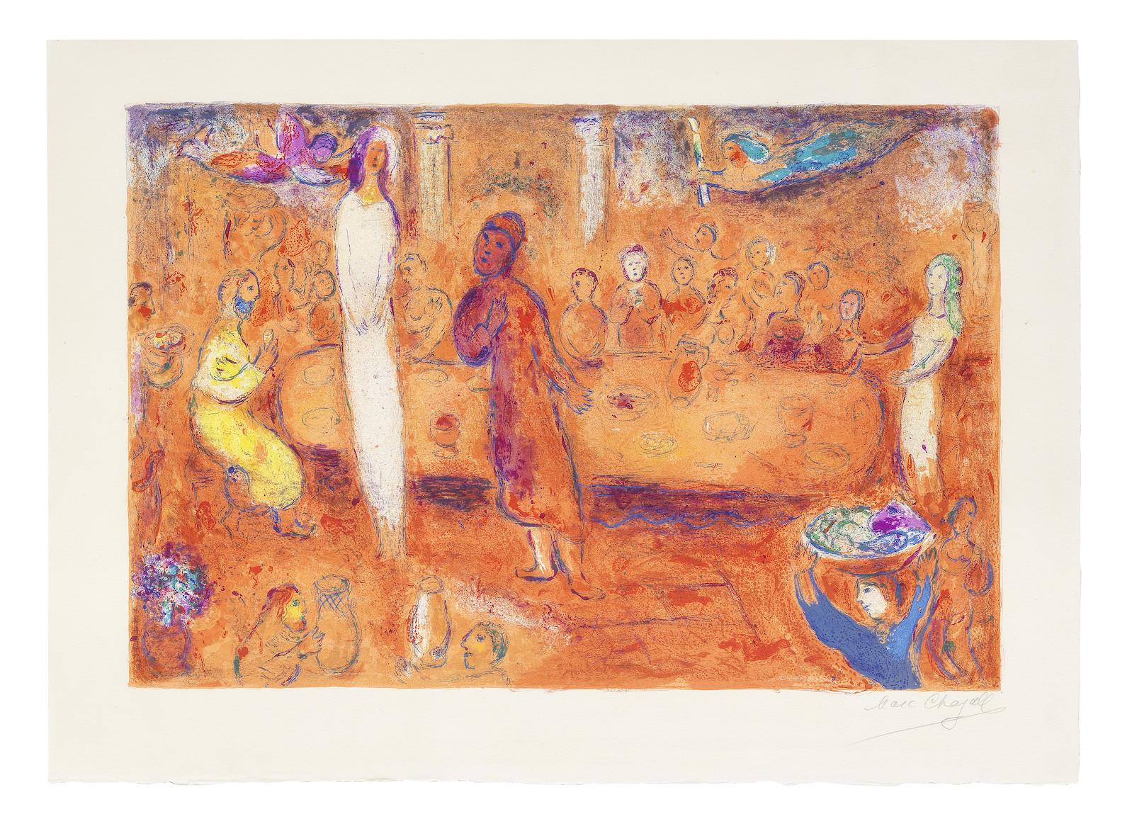 Marc Chagall, Mégaclès reconnait sa Fille pendant le Festin, from Daphnis et Chloé, 1961. Lithograph printed on Arches wove paper, signed in pencil. Estimated: $20,000 - 27,000.