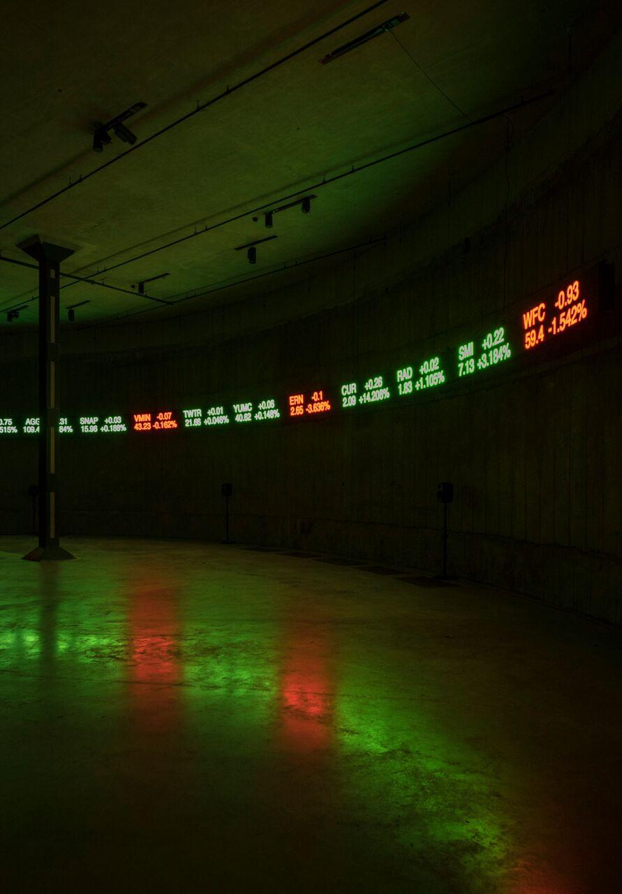 Ogboh’s The Way Earthly Things Are Going, whose title is taken from a lyric in Bob Marley’s So Much Trouble in the World, features live-streamed stock exchange data which scrolls along the circumference of the Tank in 25 metres of red, green and blue LED displays. In tandem, a spellbinding, ancient Greek lament, When I forget, I’m glad, recorded specifically for the piece,is played through twelve speakers creating a polyphonic audio installation. The song conveys tales of exile, forced migration, and the search for a better life. Nominally taking the Greek economic crisis as its subject, the work engages with issues such as migration and the international financial crisis. The Way Earthly Things Are Going is being presented to Tate by Modern Forms and will begin the artist’s representation in Tate’s collection.