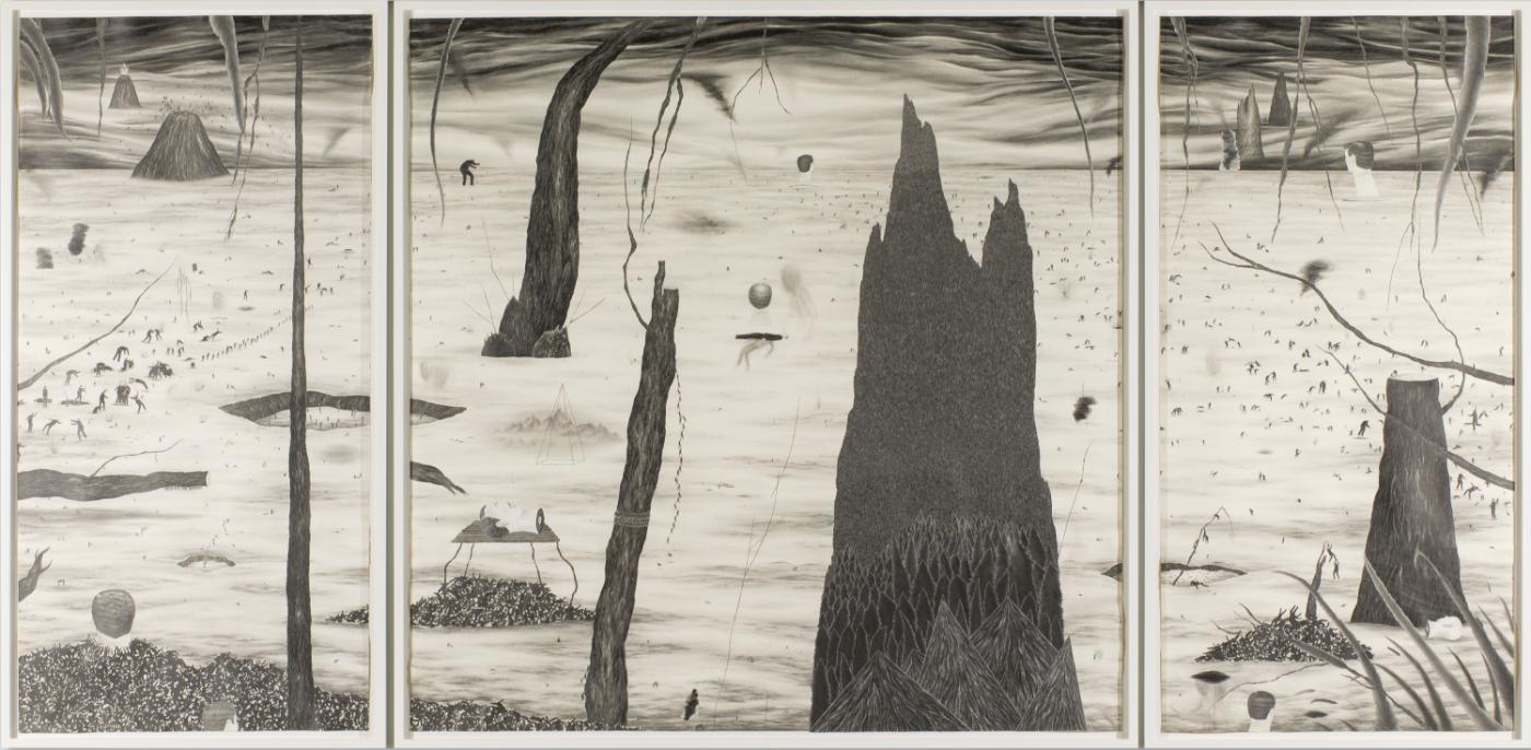 Told primarily through pencil and paper, the theme of human resilience in the face of pressing societal and ecological concerns is a central focus for each artist. Their tales offer the viewer varying modes of human engagement with one another and the natural world–whether in collective harmony, or through self-destructive impulses and shifting alliances–and the struggles that ensue. At the same time, the works draw on a range of cultural and stylistic sources, characteristic of the global nature of contemporary artmaking.