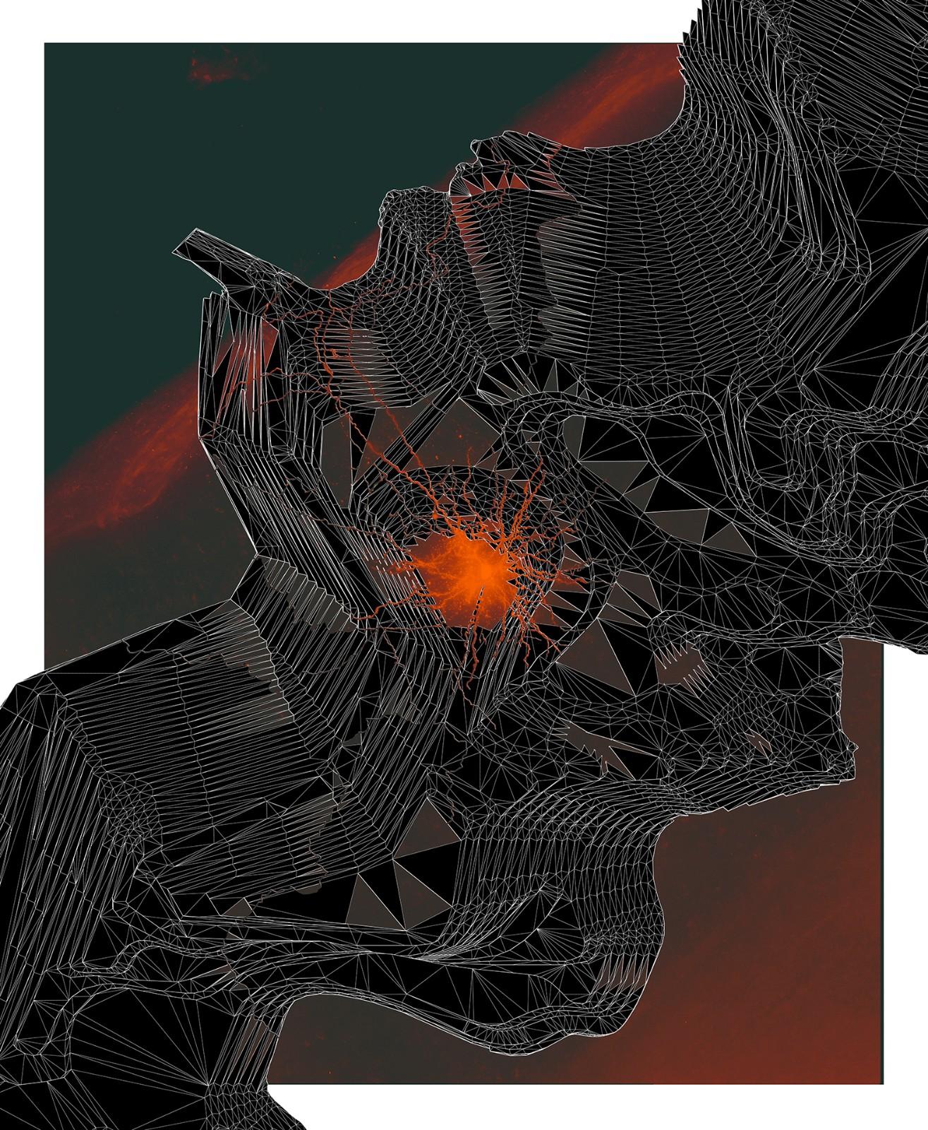 The Zairja collective, Neuropit #14 (spidergram / visual cortex neuron) from the Neuropit series, 2016-present. Collage of wireframe design for the geo-modeling of existing mining open pits / visual cortex neuron of a mouse.
