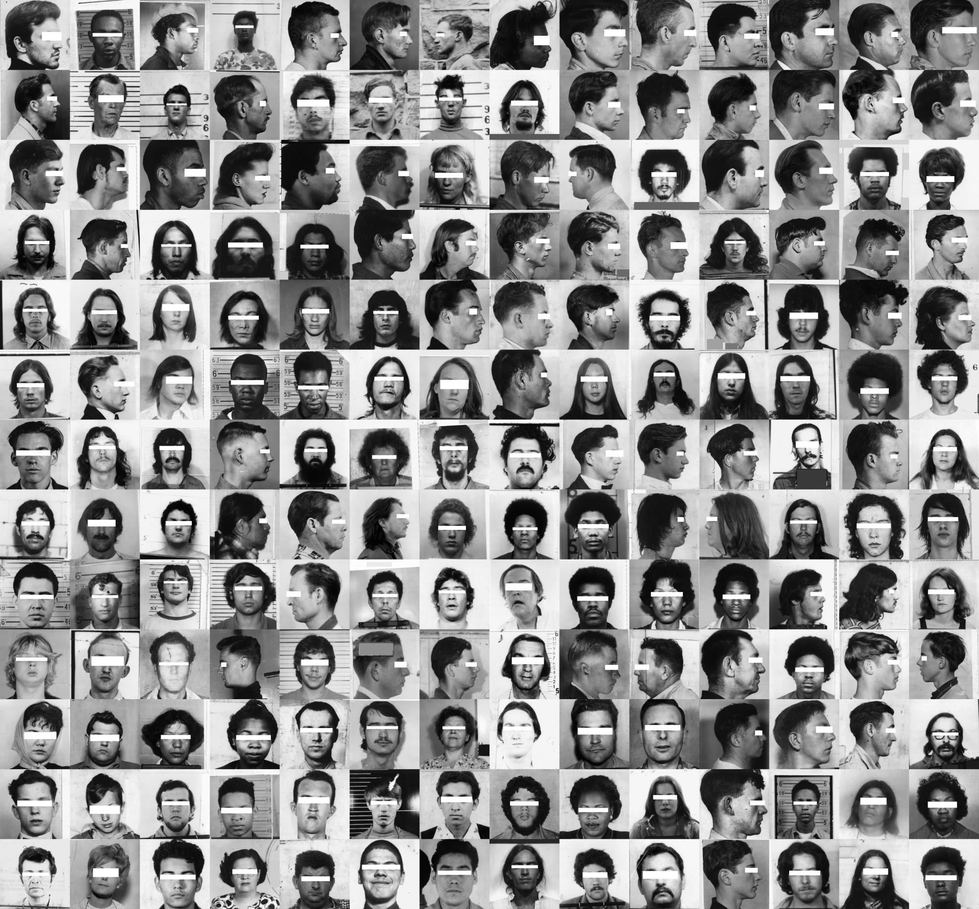 Trevor Paglen, Detail view of They Took the Faces from the Accused and the Dead... (SD18), 2019. Silver gelatine print, pins, 3240 individual images.