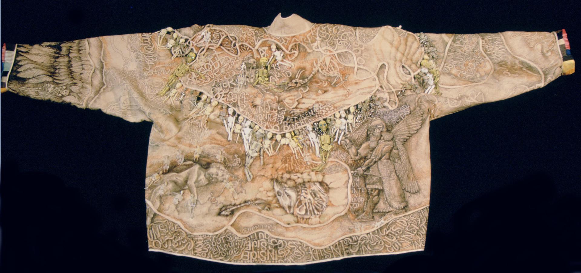The next section, Good Vibrations (Beach Boys, 1966), traces the migration of many of these young artists from the East Coast to the West Coast where they joined California’s vibrant artistic community and connected with Sandra Sakata’s Obiko. A pair of colorful denim hand-embroidered mini shorts by Anna VA Polesny embroidered while traveling conveys this new youthful spirit. Pacific Rim influences are evident in the Japanese kimono form as a blank canvas offering infinite possibilities for pattern and design. Marika Contompasis’s machine-knitted kimono made of rectangular sections, Trout-Magnolia Kimono, 1977, and Janet Lipkin’s Mexico at Midday, a coat made in 1988 are exceptional examples. The section also looks at the art of performance, reflected in Ben Compton and Marian Clayden’s Nocturnal Moth, 1974, inspired by Federico Fellini’s film La Dolce Vita (1960). A range of counter-culture influences, evoking ceremony and spirituality, pervade this section.