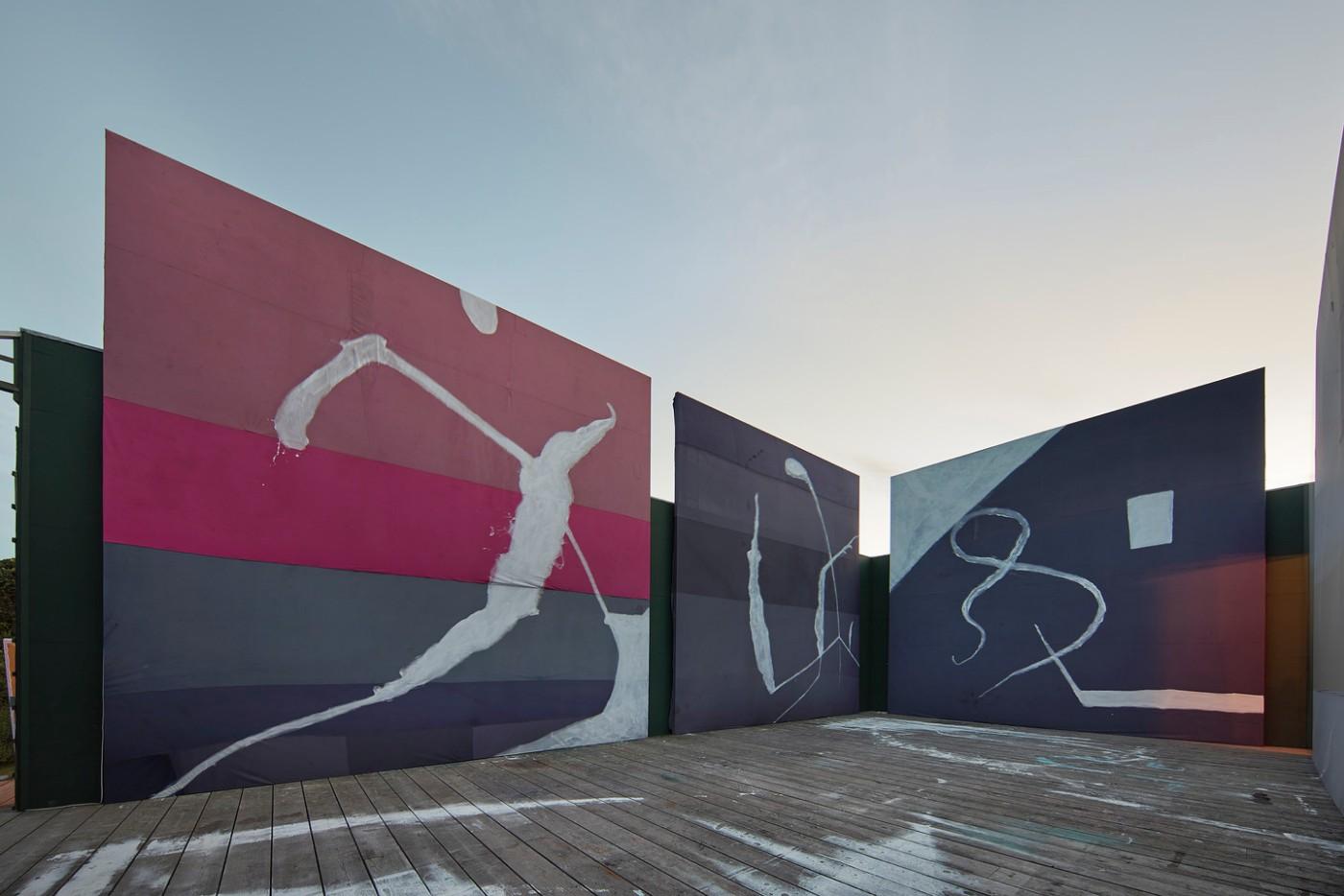 Inside the museum the exhibition will present eight paintings from three distinct bodies of work; showing the artist’s evolved, yet coherent practice. His unorthodox, highly experimental approach to the use of materials, gestures and form is explored in audaciously scaled and shaped paintings that oscillate between abstraction and figuration. Using a vast array of sources, Schnabel continuously incorporates a diversity of found materials into his works: broken plates, textiles such as Kabuki theater backdrops, sails, tarpaulins, and velvet. Images, names, and fragments of language; and thickly applied paint, resin, and digital reproductions are distributed across surfaces and support.
