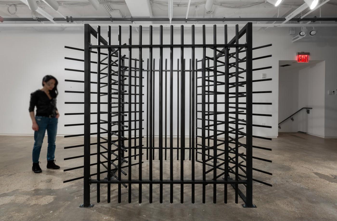 Gateway explores socio-political conflicts through architecture. Hacmon has reconstructed a section of an Israeli border checkpoint, constructed with welded steel tubes in order to convey the physicality and “weight” of traversing a border. The imprisoned space within the structure that previously held no significance, now becomes a place of contention. As viewers’ experience the piece, move in and around the immersive structure and transgress its boundaries, the architecture shifts between ‘forum’ and ‘prison,’ a space for watching or being watched.