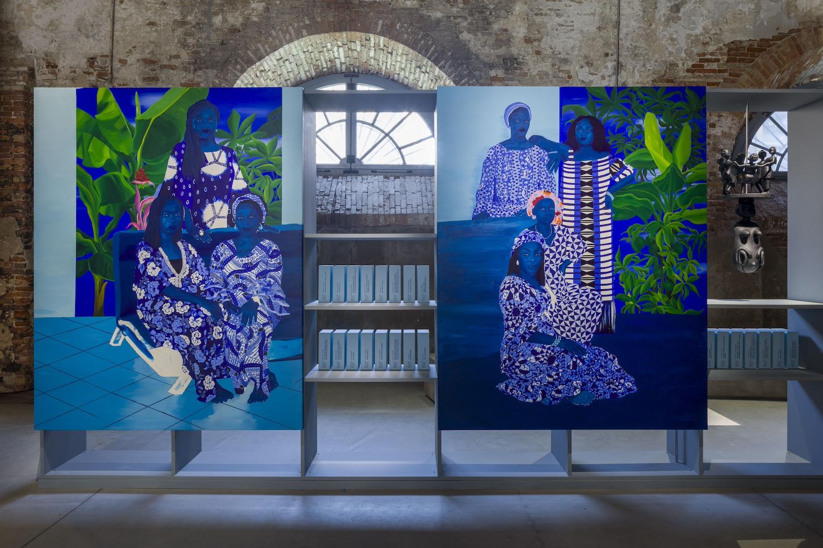 Making its Venice Biennale debut, the Pavilion of the Republic of Benin is presenting a group show with four Beninese artists and an unexpected theme of feminism. The feminism that curator Azu Nwagbogu is proposing is not the European version of women’s equality, but rather the Mother Earth variety, where life and nature are feminine and the primordial mother Iya Nla—the spirit of all creation in Yoruba cosmology—is the source of all existence. Inspired by the identification and restitution of 26 traditional objects to Benin from Paris’s Quai Branly Museum, “Everything Precious is Fragile” proclaims that culture needs to be valued. Romuald Hazoume’s dome made from recycled containers constructs a sacred space at the center of the pavilion. While Moufouli Bello beautifully captures African women on canvas at the social center in shades of blue, Chloe Quenum creates a silent orchestra with suspended instruments cast in glass, and Ishola Akpo appropriates images of African kings with women assuming the roles of the royals.