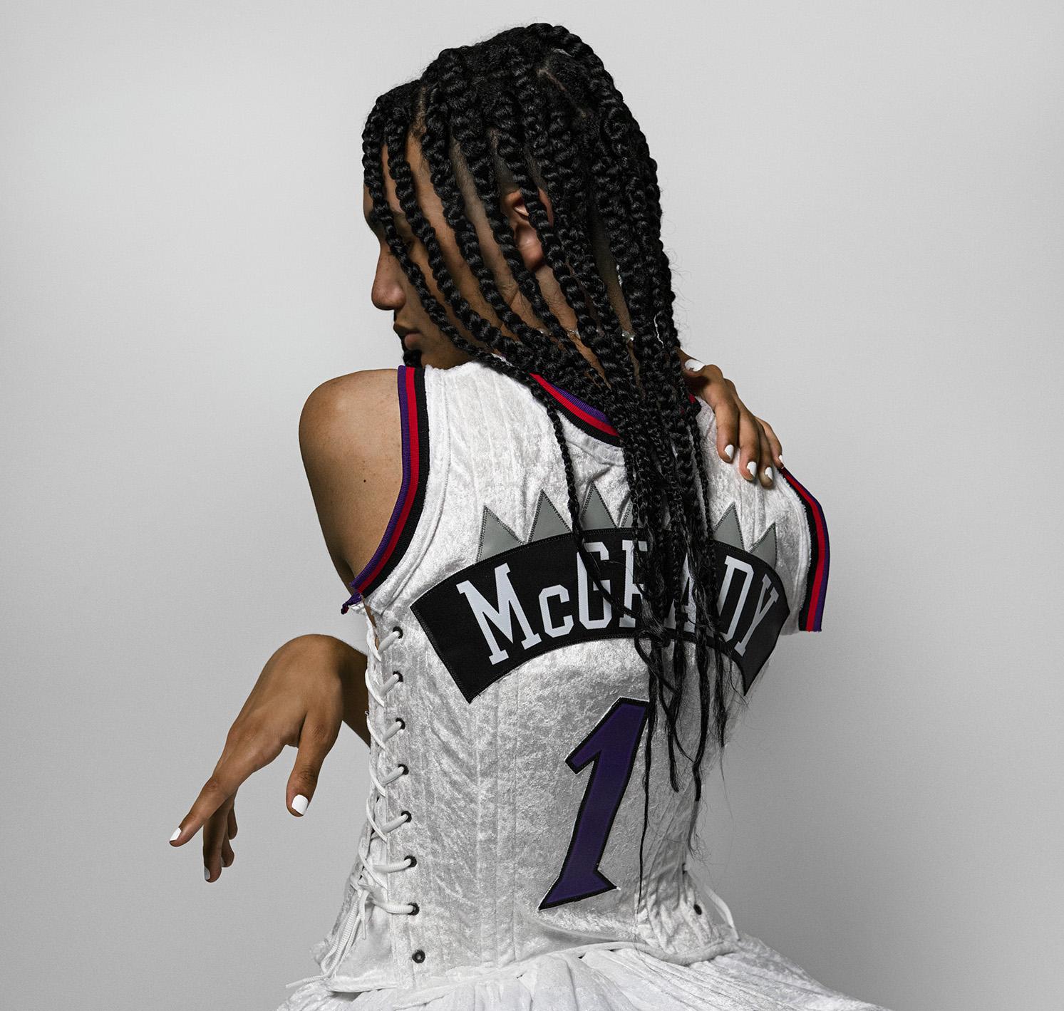 Mohamoud’s powerful work combines live performance, multimedia sculpture, textiles, and photography. One of the Boys is in part inspired by her own passion for basketball, but speaks to the many problematic associations we make between the sport, its players, and representation. Billowing gowns combine dramatic stitching and heavy draped fabrics with individual player jerseys. These compositions, born of the dresses themselves and the models who wear them, are full of juxtapositions: between gendered clothing and participation in sports, traditional “male” and “female” personas and self-presentations, celebrity and anonymity, as well as Blackness and whiteness and all the troubling cultural connotations each color has historically evoked.