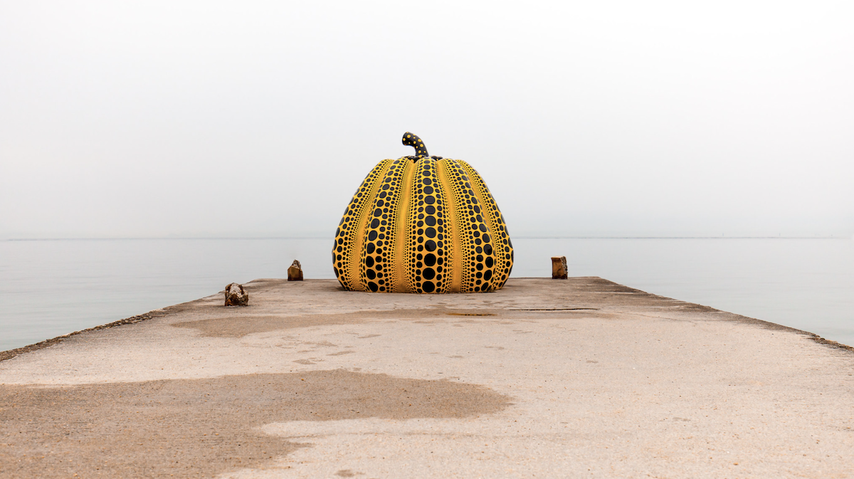 Fall decor, like a tabletop arrangement of gourds, is also a marker of the season. Yayoi Kusama has incorporated pumpkins into her art since she was a child. They show up in her works in a number of ways, from her mirrored Infinity Rooms filled with them, to shelves stacked with smaller versions, to this massive sculpture in her native Japan— which would make an enviable yard decoration.