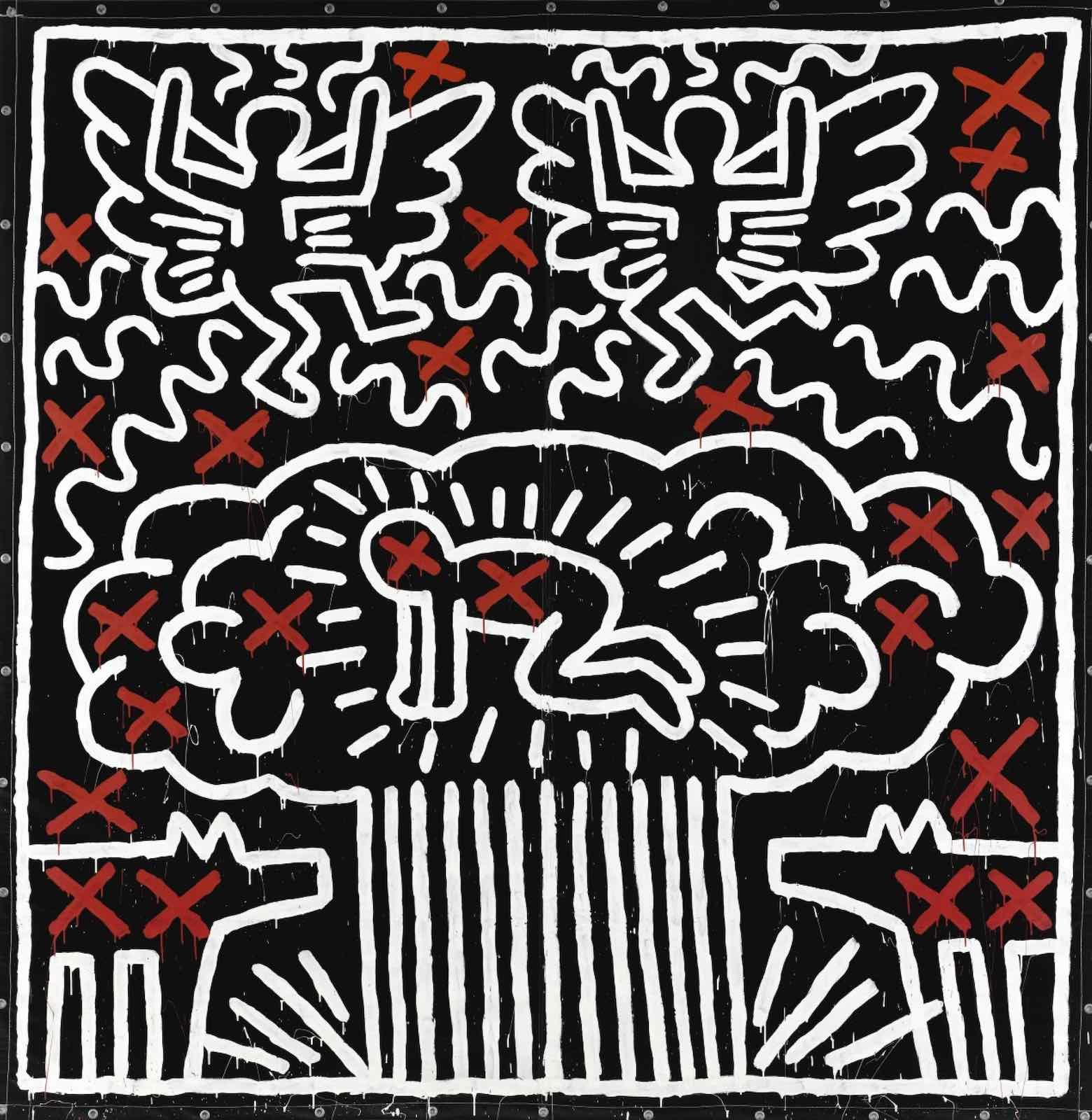 Keith Haring, detail of Untitled, 1982. Acrylic on vinyl tarpaulin with metal grommets. 121 1/2 by 118 3/4 in. 308.6 by 301.6 cm.