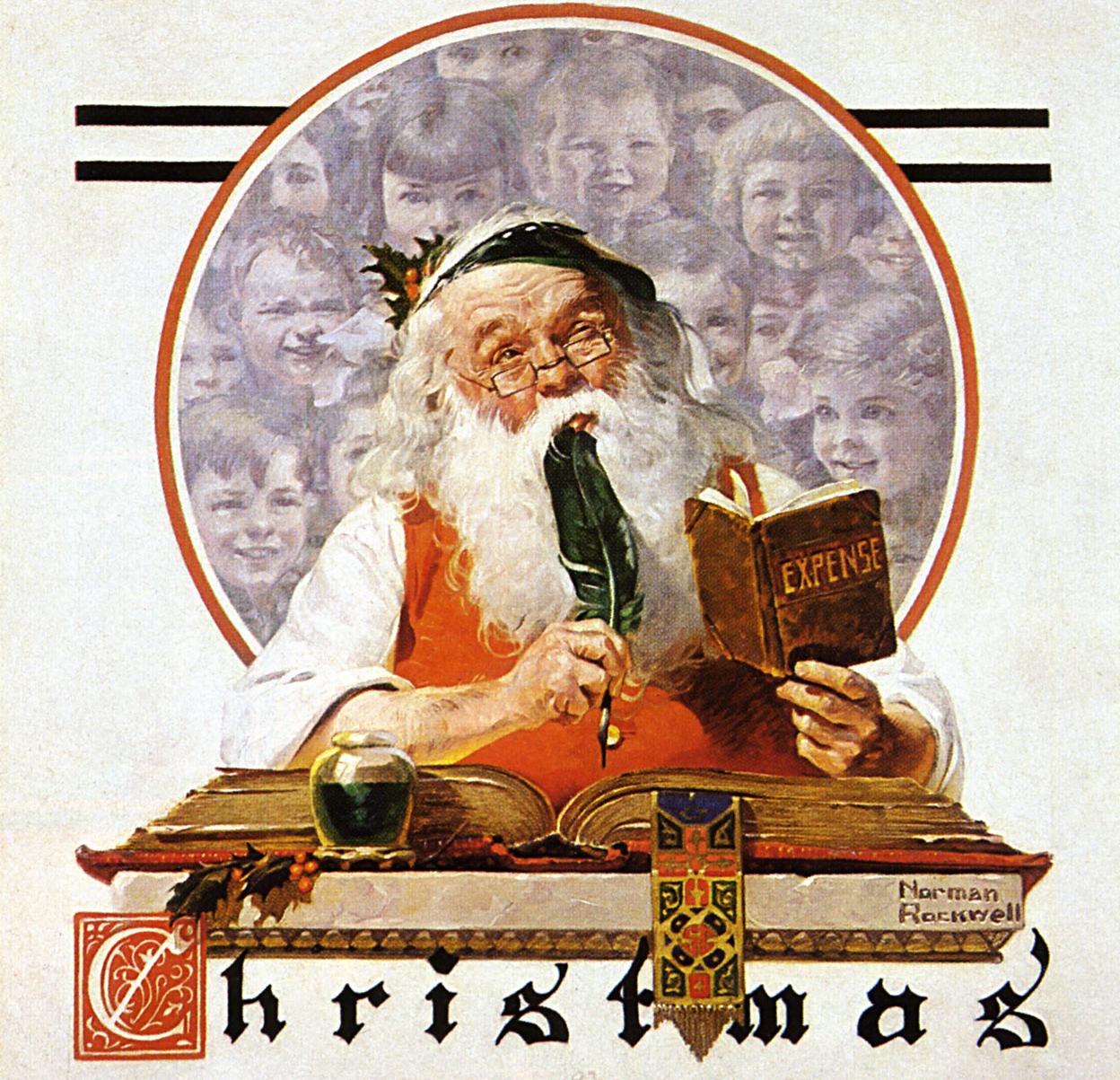 Norman Rockwell’s 1920 picture of Santa cements the red outfit and pleasantly plump physique associated with Santa Claus in the popular imagination. This benevolent, elderly man squints into the distance while going over his account books, a circle of smiling children superimposed behind him. Dressed in a slightly straining red waistcoat, with a sprig of holly in his hair, Rockwell’s Santa is undeniably festive and kind, irrevocably establishing him as the beloved gift-bringer of childhood Christmas dream.